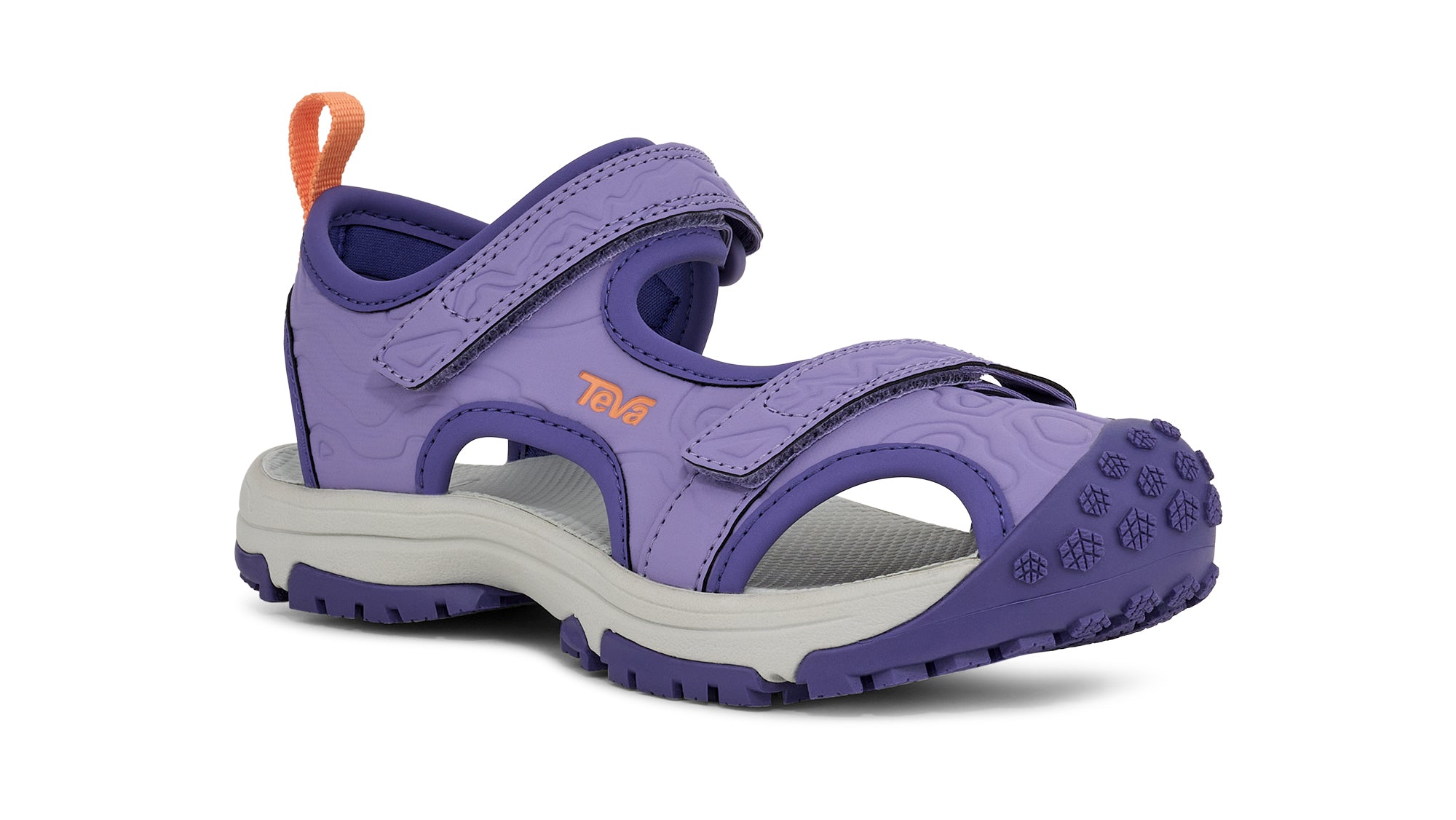 - Water-friendly synthetic closed toe sandal upper with hook and loop closures across the ankle and forefoot for adjustability